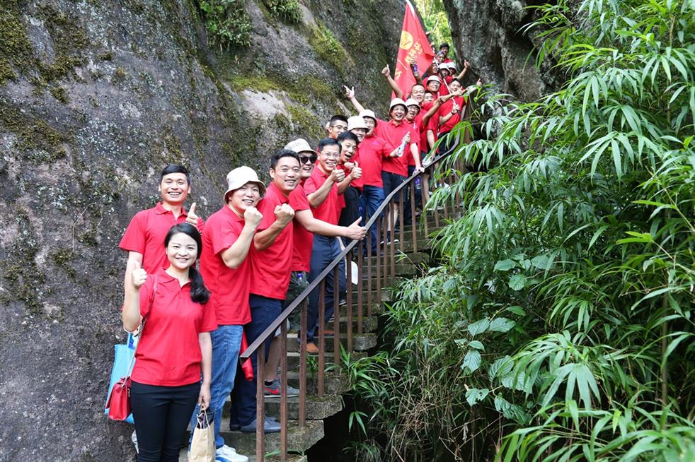 勇攀天游峰活动中,大家热情高涨,一起穿行在绿树掩映的山径中,且行且欣赏如画风景,勇攀陡峭石阶,大家互相鼓劲,相互加油,携手向着天游峰顶进发,充分展示出了天马人敢于拼搏,“团结、务实、创新、坚韧”的企业精神。经过大家不懈的努力,当所有身着鲜艳的红色衣服的天马人在天游峰顶的石碑旁齐声高喊“天马必胜”时,激情洋溢的天马人俨然成了武夷山顶红红火火的风景线。